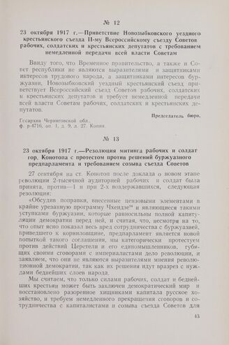 23 октября 1917 г. — Резолюция митинга рабочих и солдат гор. Конотопа с протестом против решений буржуазного предпарламента и требованием созыва съезда Советов // Г-та «Рабочий путь» № 32, 23 октября 1917 г.