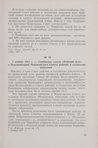 1 ноября 1917 г. — Сообщение газеты «Рабочий путь» о большевизации Черниговского Совета рабочих и солдатских депутатов // Г-та «Рабочий путь» № 175, 1 ноября 1917 г.