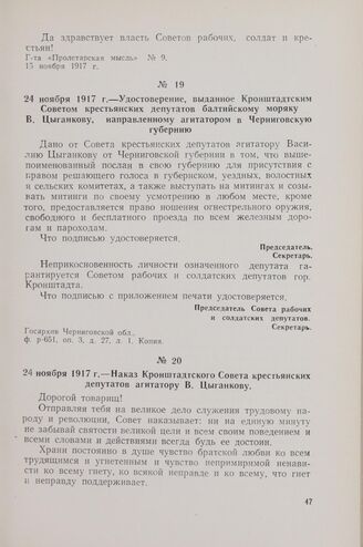 24 ноября 1917 г. — Наказ Кронштадтского Совета крестьянских депутатов агитатору В. Цыганкову // Госархив Черниговской обл., ф. р-651, oп. 3, д. 27, л. 2—3. Незаверенная копия.