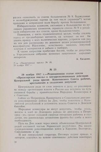 29 ноября 1917 г. — Редакционная статья газеты «Пролетарская мысль» о контрреволюционных действиях Центральной рады против Конотопского Совета рабочих, крестьянских и солдатских депутатов