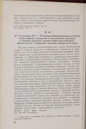 30 — 31 декабря 1917 г. — Резолюция Новозыбковского уездного съезда рабочих, солдатских и крестьянских депутатов, в которой выражено доверие рабоче-крестьянскому правительству и осуждение политики Центральной рады // ЦГАОР УССР, фонд листовок, инв. № 1939. Подлинник.