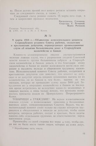 9 марта 1918 г. — Объявление исполнительного комитета Стародубского уездного Совета рабочих, солдатских и крестьянских депутатов, опровергающее провокационные слухи об изъятии большевиками денег в Стародубском казначействе и банках // Документальный фонд Центрального музея Советской Армии, инв. № 4/16861.