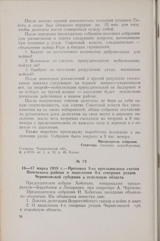 16 — 17 марта 1918 г. — Протокол 3-го крестьянского съезда Почепского района о выделении 4-х северных уездов Черниговской губернии в отдельную область // Госархив Брянской обл., ф. 1285, 1918 г., д. 16, лл. 46—47. Подлинник.