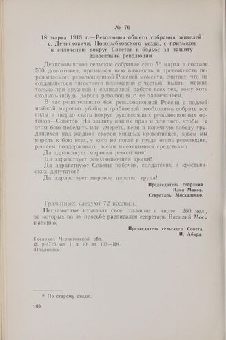 18 марта 1918 г. — Резолюция общего собрания жителей с. Денисковичи, Новозыбковского уезда, с призывом к сплочению вокруг Советов в борьбе за защиту завоеваний революции // Госархив Черниговской обл., ф. р-4716, oп. 1, д. 10, лл. 103—104. Подлинник.