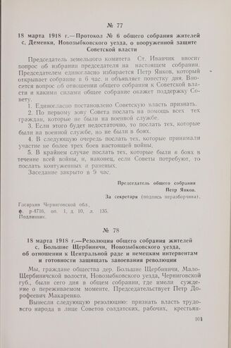 18 марта 1918 г. — Протокол № 6 общего собрания жителей с. Деменки, Новозыбковского уезда, о вооруженной защите Советской власти // Госархив Черниговской обл., ф. р-4716, oп. 1, д. 10, л. 135. Подлинник.