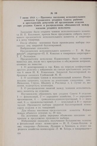 7 июня 1918 г. — Протокол заседания исполнительного комитета Суражского уездного Совета рабочих и крестьянских депутатов об организации отделов при уездном Совете и распределении обязанностей между членами уездного исполкома