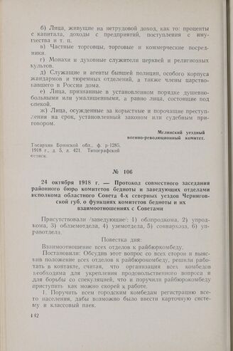 24 октября 1918 г. — Протокол совместного заседания районного бюро комитетов бедноты и заведующих отделами исполкома областного Совета 4-х северных уездов Черниговской губ. о функциях комитетов бедноты и их взаимоотношениях с Советами