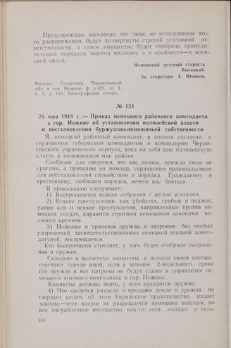 26 мая 1918 г. — Приказ немецкого районного коменданта в гор. Нежине об установлении полицейской власти и восстановлении буржуазно-помещичьей собственности