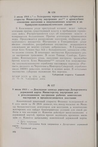 8 июля 1918 г. — Докладная записка директора Департамента державной варты Министерству внутренних дел о революционном настроении рабочих конотопских мастерских и предполагающемся восстании