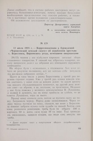 12 июля 1918 г. — Корреспонденция в буржуазной «Черниговской земской газете» об ограблении крестьян с. Берестовец, Борзенского уезда, немецкими оккупантами