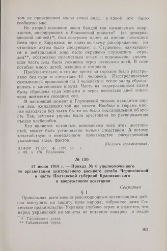 17 июля 1918 г. — Приказ № 6 уполномоченного по организации центрального военного штаба Черниговской и части Полтавской губерний Крапивянского о вооруженном восстании