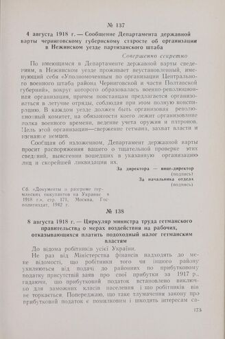 4 августа 1918 г. — Сообщение Департамента державной варты черниговскому губернскому старосте об организации в Нежинском уезде партизанского штаба // Сб. «Документы о разгроме германских оккупантов на Украине в 1918 г.», стр. 171, Москва, Госполитиздат, 1942 г.