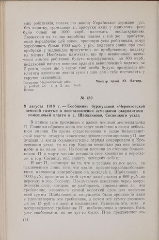9 августа 1918 г. — Сообщение буржуазной «Черниговской земской газеты» о восстановлении немецкими оккупантами помещичьей власти в с. Шабалиново, Сосницкого уезда
