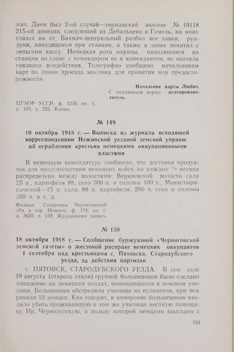 18 октября 1918 г. — Сообщение буржуазной «Черниговской земской газеты» о жестокой расправе немецких оккупантов 1 сентября над крестьянами с. Пятовска, Стародубского уезда, за действия партизан