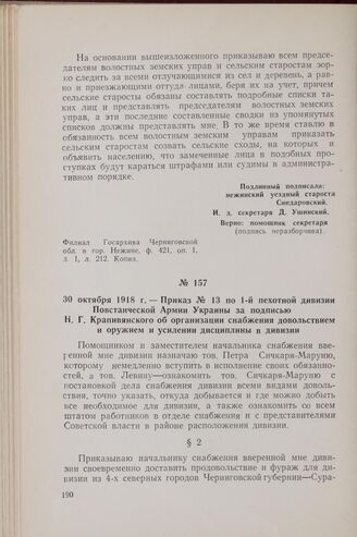 30 октября 1918 г. — Приказ № 13 по 1-й пехотной дивизии Повстанческой Армии Украины за подписью Н. Г. Крапивянского об организации снабжения довольствием и оружием и усилении дисциплины в дивизии