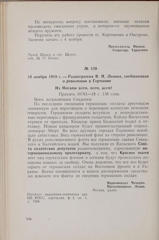 10 ноября 1919 г. — Радиограмма В. И. Ленина, сообщающая о революции в Германии // Институт марксизма-ленинизма при ЦК КПСС, партархив, ф. 2, oп. 1, д. 7406.