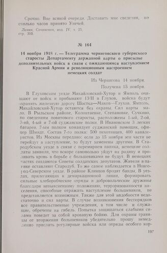 14 ноября 1918 г. — Телеграмма черниговского губернского старосты Департаменту державной варты о присылке дополнительных войск в связи с ожидающимся наступлением Красной Армии и революционным настроением немецких солдат
