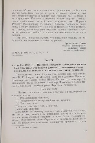 8 декабря 1918 г. — Протокол заседания командного состава 1-й Советской Украинской дивизии о взаимоотношениях командования дивизии с местными советскими властями
