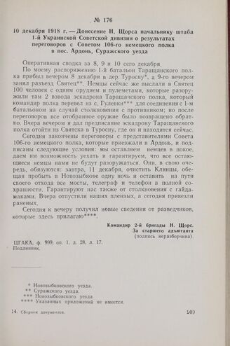 10 декабря 1918 г. — Донесение Н. Щорса начальнику штаба 1-й Украинской Советской дивизии о результатах переговоров с Советом 106-го немецкого полка в пос. Ардонь, Суражского уезда // ЦГАКА, ф. 999, oп. 1, д. 28, л. 17. Подлинник.