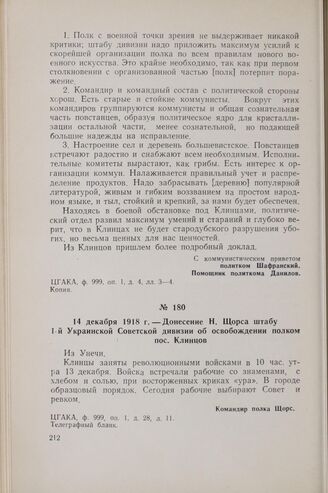 14 декабря 1918 г. — Донесение Н. Щорса штабу 1-й Украинской Советской дивизии об освобождении полком пос. Клинцов