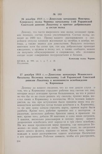 27 декабря 1918 г. — Донесение командира Нежинского батальона Несмеяна начальнику 1-ой Украинской Советской дивизии Лакатошу о возможности освобождения м. Корюковки // ЦГАКА, ф. 999, oп. 1, д. 8, л. 14. Подлинник.