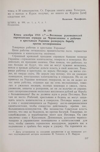 Конец декабря 1918 г. — Воззвание руководителей партизанских отрядов на Черниговщине к рабочим и крестьянам Украины развернуть борьбу против петлюровщины // ЦГАКА, ф. 99.9, oп. 1, д. 5, л. 6. Подлинник.