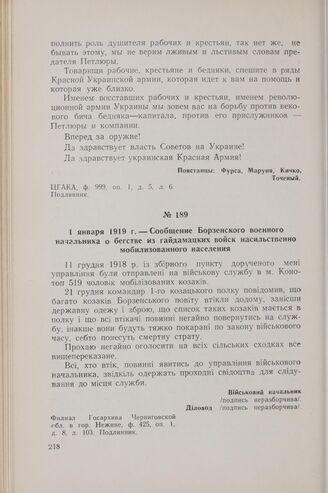 1 января 1919 г. — Сообщение Борзенского военного начальника о бегстве из гайдамацких войск насильственно мобилизованного населения // Филиал Госархива Черниговской обл. в гор. Нежине, ф. 425, oп. 1, д. 8, л. 103. Подлинник.