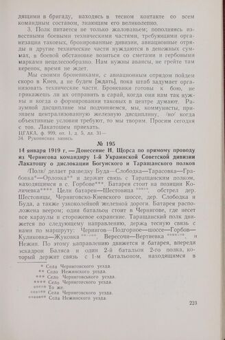 14 января 1919 г. — Донесение Н. Щорса по прямому проводу из Чернигова командиру 1-й Украинской Советской дивизии Лакатошу о дислокации Богунского и Таращанского полков