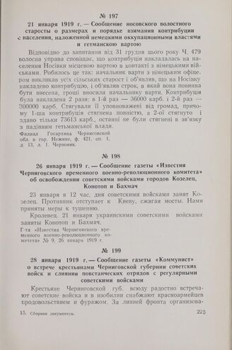 26 января 1919 г. — Сообщение газеты «Известия Черниговского временного военно-революционного комитета» об освобождении советскими войсками городов Козелец, Конотоп и Бахмач