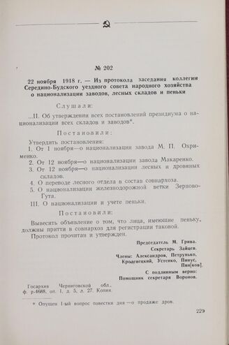 22 ноября 1918 г. — Из протокола заседания коллегии Середино-Будского уездного совета народного хозяйства о национализации заводов, лесных складов и пеньки // Госархив Черниговской обл., ф. р-4688, oп. 1, д. 5, л. 27. Копия.