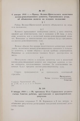 4 января 1919 г. — Приказ Велико-Щимельского волостного военно-революционного комитета, Городнянского уезда, об объявлении волости на осадном положении // Госархив Черниговской обл., ф. р-136, oп. 1, д. 1, л. 3. Подлинник.