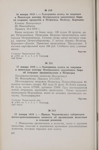 17 января 1919 г. — Телеграмма агента по закупкам в почепскую контору Центрального закупочного бюро об отправке продовольствия в Петроград