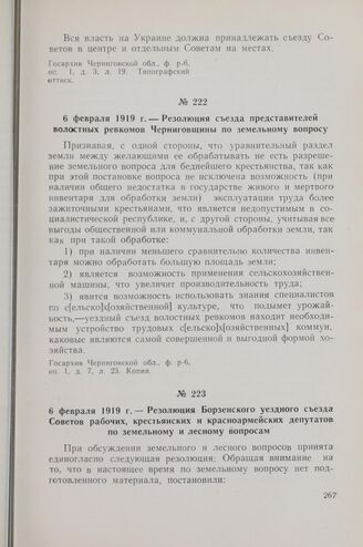 6 февраля 1919 г. — Резолюция съезда представителей волостных ревкомов Черниговщины по земельному вопросу // Госархив Черниговской обл., ф. р-6, оп. 1, д. 7, л. 23. Копия.