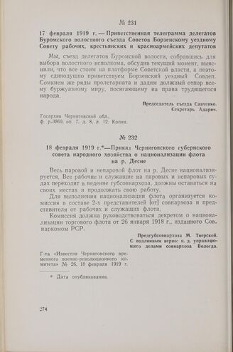 18 февраля 1919 г. — Приказ Черниговского губернского совета народного хозяйства о национализации флота на р. Десне // Г-та «Известия Черниговского временного военно-революционного комитета» № 26, 18 февраля 1919 г.