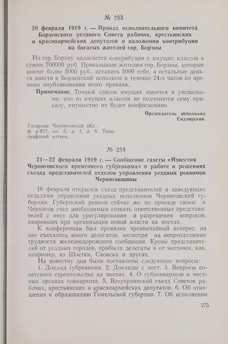 20 февраля 1919 г. — Приказ исполнительного комитета Борзенского уездного Совета рабочих, крестьянских и красноармейских депутатов о наложении контрибуции на богатых жителей гор. Борзны // Госархив Черниговской обл., ф. р-817, oп. 3, д. 1, л. 6. Типографский оттиск.