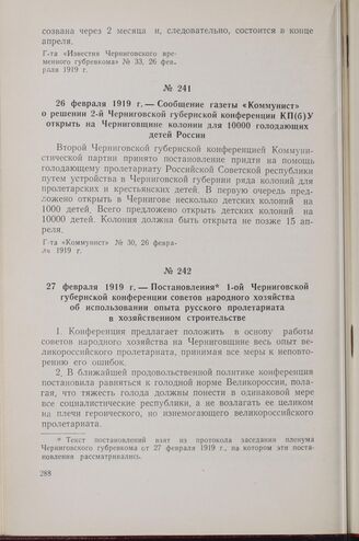 27 февраля 1919 г. — Постановления 1-ой Черниговской губернской конференции советов народного хозяйства об использовании опыта русского пролетариата в хозяйственном строительстве