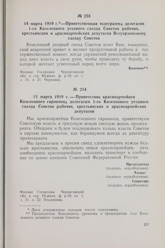 14 марта 1919 г. — Приветственная телеграмма делегатов 1-го Козелецкого уездного съезда Советов рабочих, крестьянских и красноармейских депутатов Всеукраинскому съезду Советов // Филиал Госархива Черниговской обл. в гор. Нежине, ф. р-19, oп. 1, д. 21, л. 21. Черновик.