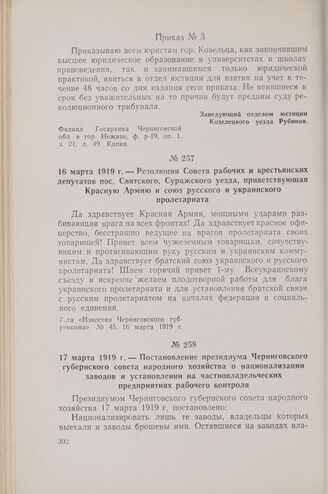 16 марта 1919 г. — Резолюция Совета рабочих и крестьянских депутатов пос. Святского, Суражского уезда, приветствующая Красную Армию и союз русского и украинского пролетариата
