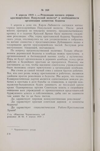 4 апреля 1919 г. — Резолюция митинга отряда красноармейцев Пакульской волости о необходимости организации комитетов бедноты // Г-та «Известия Черниговского губревкома» № 60, 4 апреля 1919 г.