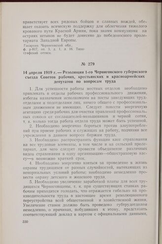 14 апреля 1919 г. — Резолюция 1-го Черниговского губернского съезда Советов рабочих, крестьянских и красноармейских депутатов по вопросам труда