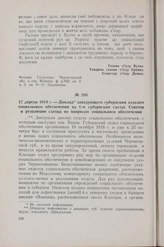 17 апреля 1919 г. — Доклад заведующего губернским отделом социального обеспечения на 1-м губернском съезде Советов и резолюции съезда по вопросам социального обеспечения // Г-та «Известия Черниговского губревкома» № 70, 17 апреля 1919 г.