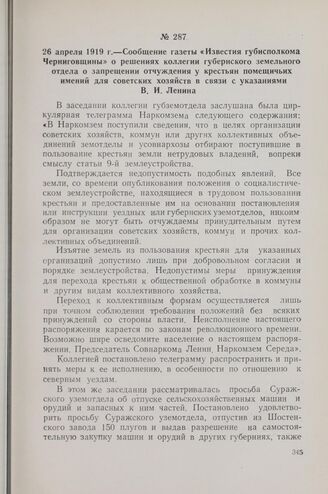 26 апреля 1919 г. — Сообщение газеты «Известия губисполкома Черниговщины» о решениях коллегии губернского земельного отдела о запрещении отчуждения у крестьян помещичьих имений для советских хозяйств в связи с указаниями В. И. Ленина