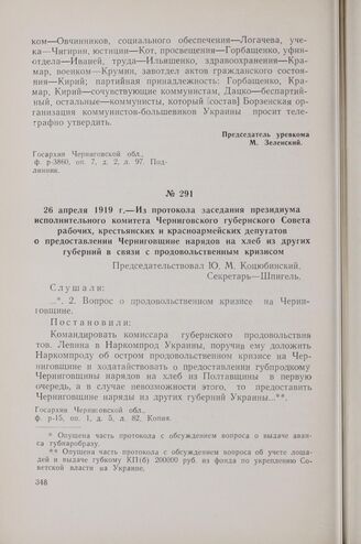 26 апреля 1919 г. — Из протокола заседания президиума исполнительного комитета Черниговского губернского Совета рабочих, крестьянских и красноармейских депутатов о предоставлении Черниговщине нарядов на хлеб из других губерний в связи с продовольственным кризисом // Госархив Черниговской обл., ф. р-15, oп. 1, д. 5, л. 82. Копия.