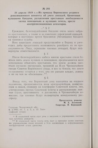 28 апреля 1919 г. — Из приказа Борзенского уездного революционного комитета об учете лошадей, брошенных кулацкими бандами, разъяснении крестьянам необходимости засева помещичьих и кулацких земель, аресте контрреволюционных агитаторов // Госархив Черниговской обл., ф, р-3860, oп. 7, д. 5, л. 13. Типографский оттиск.