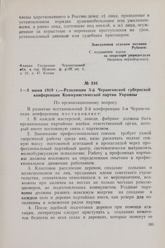 1 — 3 июня 1919 г. — Резолюции 3-й Черниговской губернской конференции Коммунистической партии Украины // Черниговский партархив, ф. 4, oп. 1, л. 19, л. 27—68. Копия.