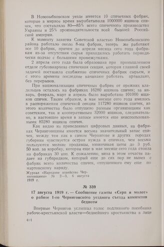17 августа 1919 г. — Сообщение газеты «Серп и молот» о работе 1-го Черниговского уездного съезда комитетов бедноты // Г-та «Серп и молот» № 5, 17 августа 1919 г.