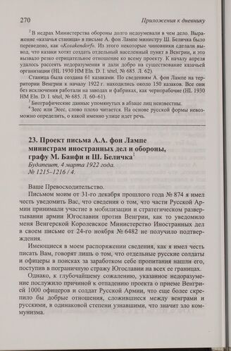Проект письма А.А. фон Лампе министрам иностранных дел и обороны, графу М. Банфи и Ш. Беличка. Будапешт, 4 марта 1922 года