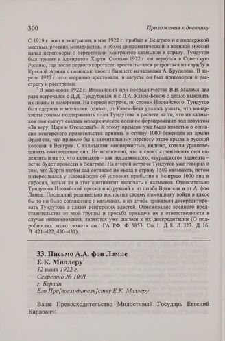 Письмо А.А. фон Лампе Е.К. Миллеру. г. Берлин, 12 июля 1922 г. // ГА РФ. Ф. 5853. Оп. 1. Д. 8. Л. 289-293. Машинопись, копия, русский.