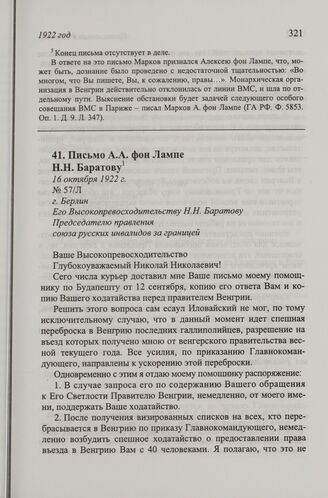 Письмо А.А. фон Лампе Н.Н. Баратову. г. Берлин, 16 октября 1922 г. // ГА РФ. Ф. 5853. Оп. 1. Д. 9. Л. 230-231. Машинопись, копия, русский.