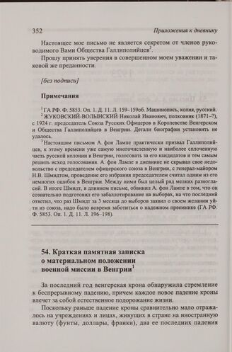 Краткая памятная записка о материальном положении военной миссии в Венгрии. Конец апреля - начало мая 1923 г. // ГА РФ. Ф. 5853. Оп. 1. Д. 11. Л. 96-99. Машинопись, копия, русский.
